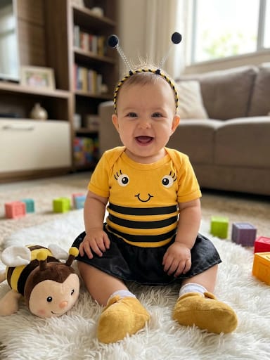 O body temático da Abelhinha  é uma roupinha lúdica e confortável, ideal para mesversários e festas, estampada com os detalhes do traje preto e amarelo. Geralmente confeccionado em 100% algodão ou suedine, possui gola transpassada e botões de pressão para facilitar a troca